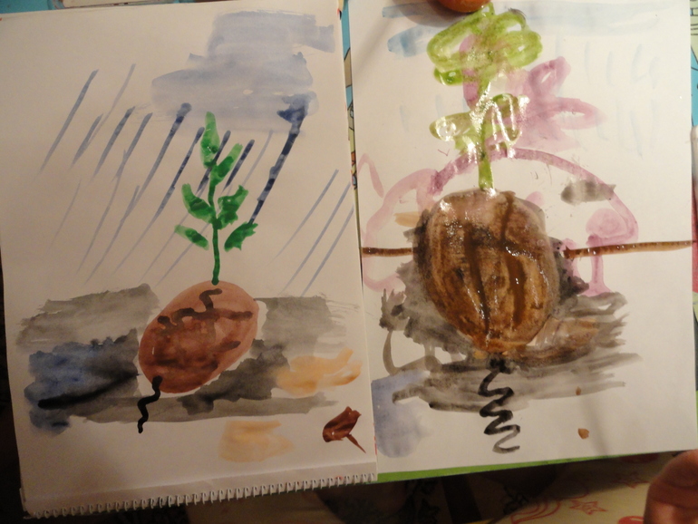 Вот наш желудь упал, его накрыло листиком. Катя еще нарисовала ему зонтик)))) Потом залило дождем, засыпало снегом и он оказался в земле, а весной из него показался молоденький дубок.