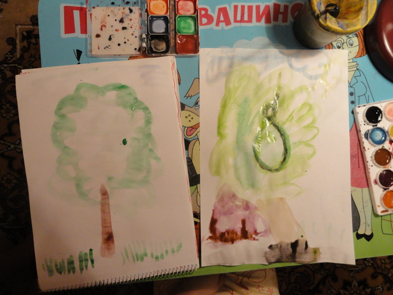 Мы попробовали технику рисования дождя по наклонной поверхности. Катю это удивило, хоть получилось не очень ярко.
