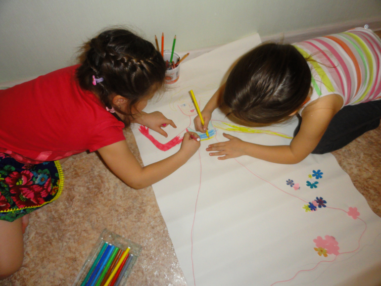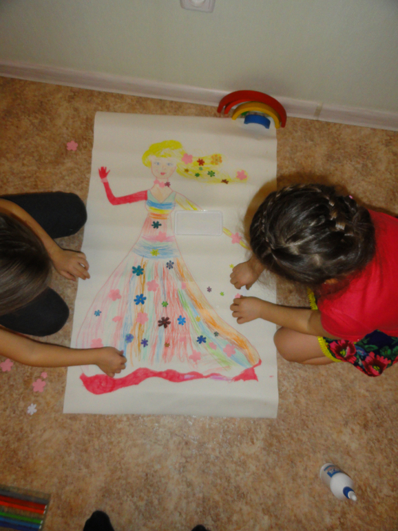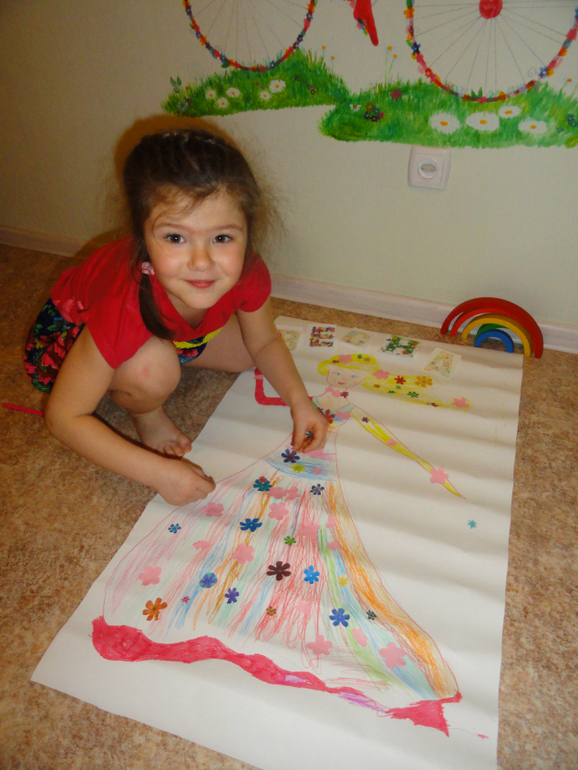 Когда поплясали от души, я внесла под конец мелодии и саму Весну (быстро набросала контуры на куске обоев). Девчонки быстро подхватили мою игру. Я говорила от имени Весны, просила помочь снять чары Зимы, которая забрала все краски с моего платья. Все, что мне удалось сохранить, находится в конверте. Это конечно были цветочки, вырезанные из цветной бумаги. Девочки принялись за роботу. Я их подбадривала и рассказывала, какие цвета мне больше всех нравятся и какая я счастливая весна.