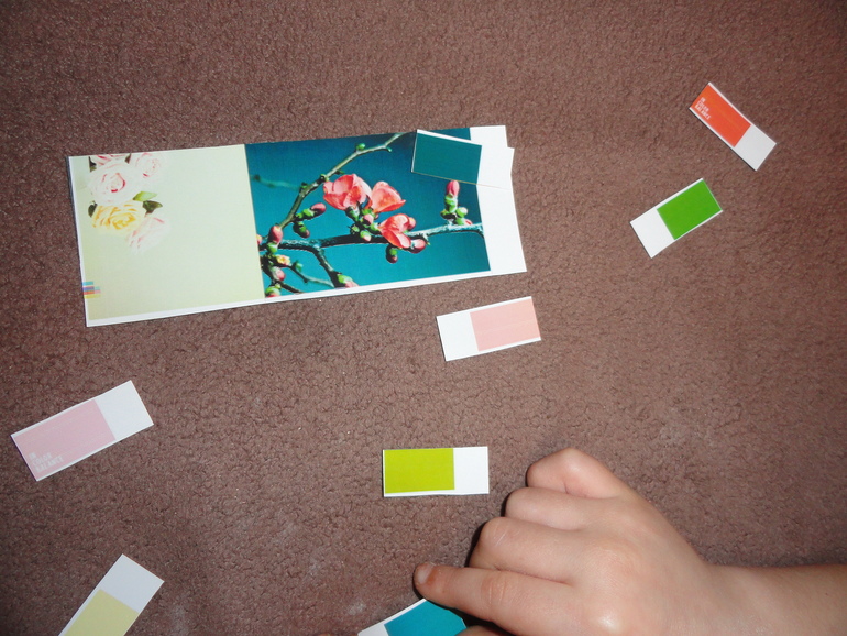 Покрутив цветочек, Катя выбрала категорию "Цветы". Посмотрели, какие бывают весенние цветы. Собрали небольшую палитру.