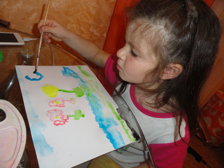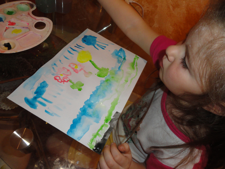 И конечно рисовали на акварельной бумаге. У Катюшки уже значительно лучше получается работать с акварелью, чтоб не получалось грязи. Здесь пыталась сделать отражение цветов в ручье.
