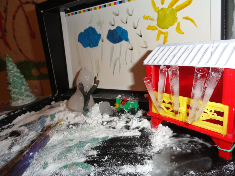 Я пока подготовила сенсорную коробочку с искусственным снегом, под ним пластилиновый ручей, зеленая полянка. Расчищали кисточкой, потом лопатой. Потом нарисовали солнышку лучики и появились сосульки. красили сосульки и снеговика, наблюдали, как тают, дождались, пока одна упала. Обсудили безопасность.