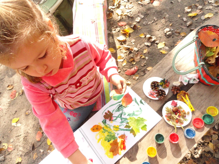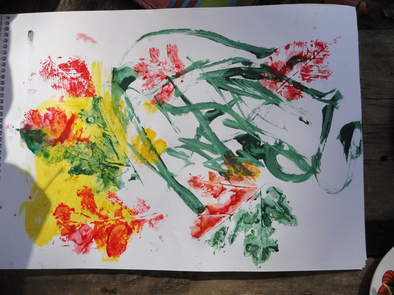 На этот раз я взяла в лес еще и краски. Так что после обеда, которого наш вечно голодный ребенок еле дождался, нас ждало творчество. Шашлык кстати удался на славу. Дали впервые попробовать Кате. Пробовала настороженно , с опаской (не любит она ничего нового), а потом просила еще и еще. Благо, мы запекли еще картошку в фольге, а то свинина все же тяжеловата. В конце сказала: спасибо тебе, папа, за шашлык)))