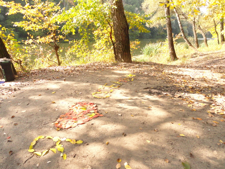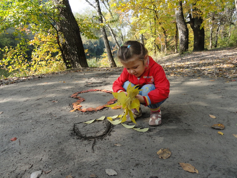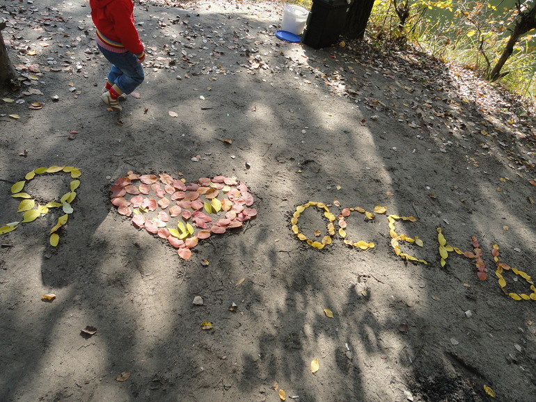 Катю правда обеспокоил вопрос, что папа наломал веток. Разве дереву не больно? Вот какая заботливая))) Когда площадка была очищена от старых листьев, я написала "Я люблю осень". Мы собрали разноцветные листья и стали выкладывать ими буквы. Получилось классно! Правда не на долго((( Ветер быстро навел свой порядок, засыпал новыми листьями. Но сам процесс Катюше понравился.