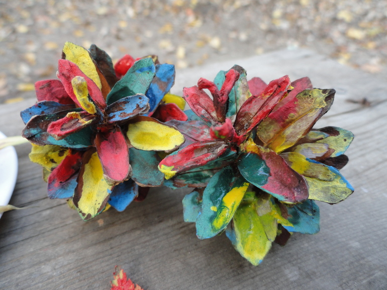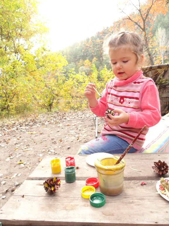 Катя очень удивилась краскам в лесу. Но игру приняла с удовольствием. Я предложила помочь осени и раскрасить кроме листьев еще шишки, а то что ж они одного цвета. Им наверное обидно. Процесс Катю явно увлек. Получилось очень ярко и даже лучше, чем у меня. Катина шишка на фото справа.