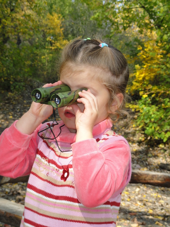 Потом началось уже баловство, так что я отправила ребенка к папе, посмотреть как там ловится рыба. Папа тоже предложил Кате кое-что интересное. У него оказался настоящий бинокль. В даль у Катюши ничего не получилось, а вот на приближение (перевернула) все рассматривала с удовольствием))