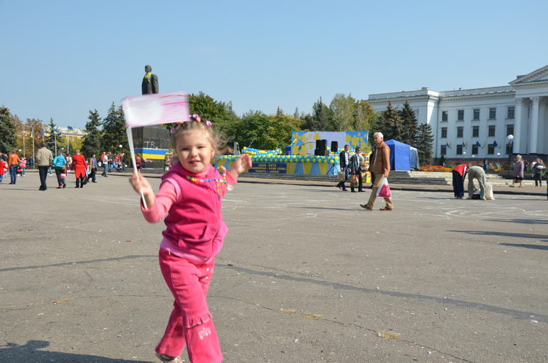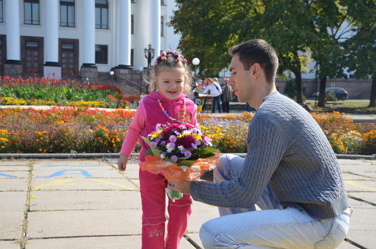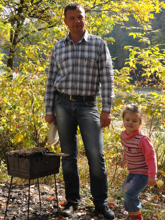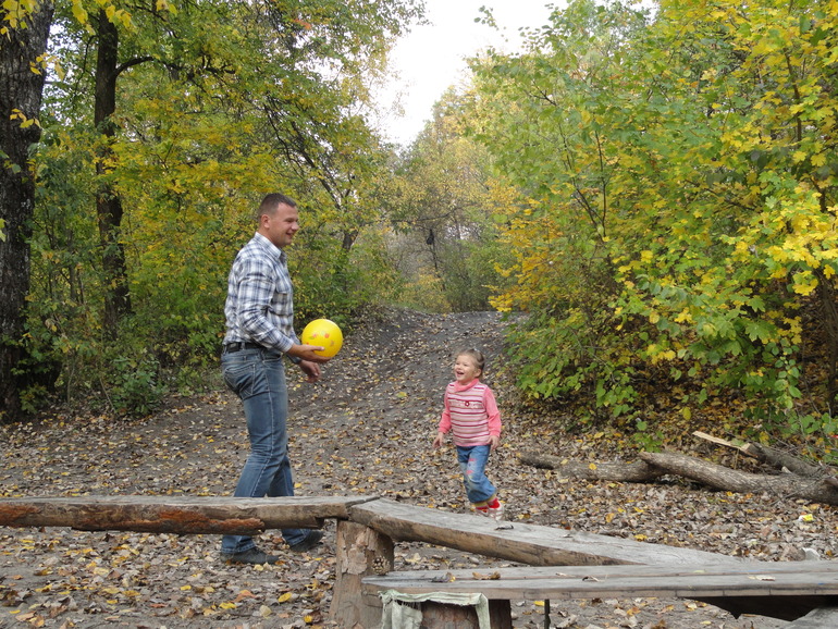 Но все же самым ярким впечатлением был приезд дяди. Из-за войны мы не виделись с июня, а в Краматорске он не был и вовсе с мая. Так что встреча была интересна всем. Жаль, что времени у нас было мало. С утра (с 7-ми. как только проснулась) Катюша мне все уши прожужжала, ну когда же он приедет, а что мы ему скажем, а что покажем, а что он ответит... На все синие машины бурно реагировала, а вдруг это он. Так соскучилась, куколка... Сама выбирала. что одеть и без проблем (как обычно это бывает) дала себя заплести и одеть. А вот когда приехали, то долго стеснялась, пряталась за меня. Но потом разошлась. У нас уже в традицию наверное войдет осенняя фотосессия от дяди)))