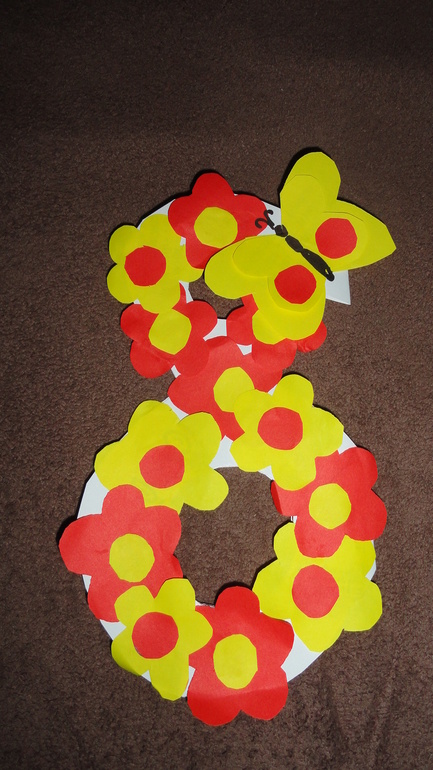 Вот бабушкам к 8 марта такие восьмерки. Кате 2г.8 м. Сама клеила все цветочки и серединки. Я только нарисовала усики бабочке. Поздравление подписывали сначала буквами вырезанными из журналов.