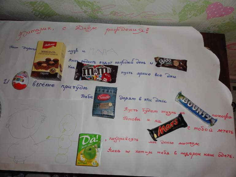 Газета с Катиным рисунком папе на День рождения. 3г4м.