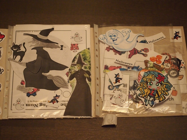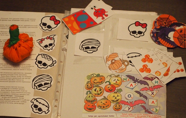 3 разворота, слева на фото история праздника Хэллоуин, справа кармашки с играми и прочая математика для малышни.