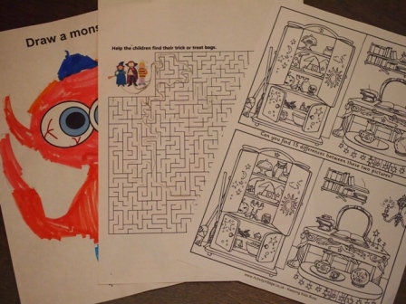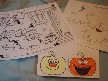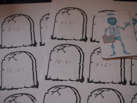 На третьем этаже кот в кресле дал задание сосчитать всех- кошек во дворе и подсказал как пройти мимо приведений. Нарисовать им лица и подарить по смешной тыковке. А скелет попросил помочь отыскать дом (могилу) для каждого родственника скелета.