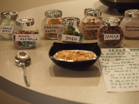 Затем ребенок встречает старую ведьму в лице своей мамы))) она приглашает его к котлу, но тут же замечает, что у неё не хватает 3-х ингредиентов, которые нужно найти. Первые два хранятся у Гоблина (папы), но он их так просто не отдает, нужно выполнить задания. Третье зелье находится в болоте. что бы его взять нужно пройти мимо крикливой кикиморы (сестренка) и от неё тоже есть задание. Когда все ингредиенты для зелья найдены ведьма передает рецепт зелья.