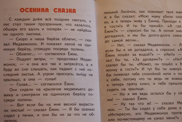 Конечно про ёжика здесь один рассказ, но зато какой. У меня долго в голове крутилась фраза "Бежал ёжик по дорожке только пяточки мелькали..."