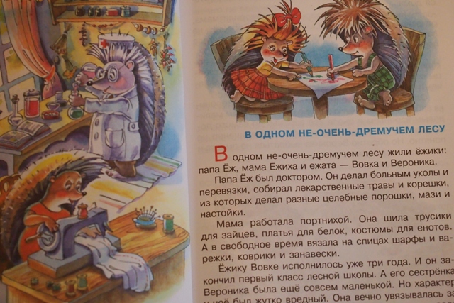 Само содержание книги: Книга о семействе Ёжиков. Папа ёж - врач,. мама ежиха - портниха и их дети Вовка и младшая сестренка Вероника (стихоплётчица). С маленькими ежиками происходят весёлые и поучительные приключения. Ёжики собирают грибы и ягоды, узнают окружающий мир, знакомятся с соседями.