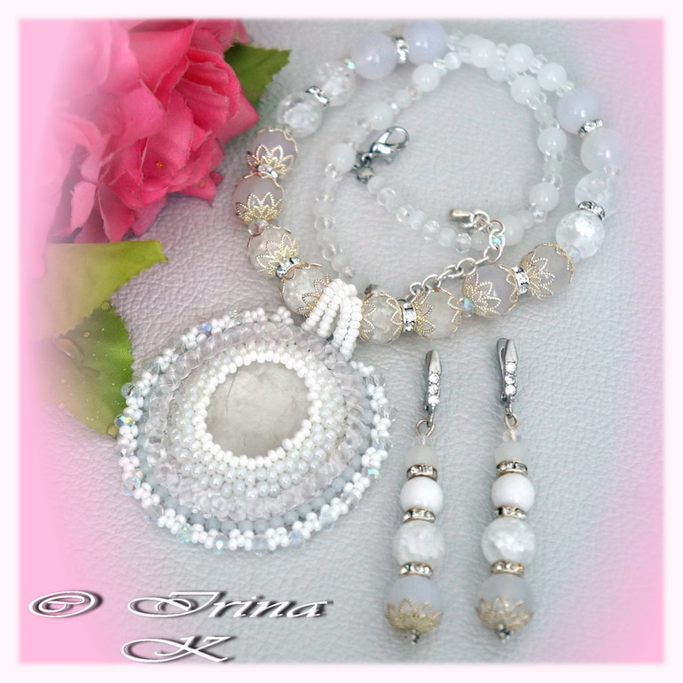Очень нежный кулон изготовлен с использованием кабошона натурального кварца, бусин белого жада, кошачьего глаза, переливающихся всеми цветами хрустальных радужных бусин, бусин искусственного кварца, чешского и японского бисера. На бусинах нежные ажурные шапочки, между бусинами высококачественные южно-корейские рондели с фианитиками.