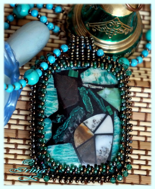 Эксклюзивная мозаика, использованная для создания этого кулона настолько хороша, что не требует почти никакого дополнительного "украшательства". Кулон из натуральных камней: тагилита, мохового агата, амазонита, оникса.
