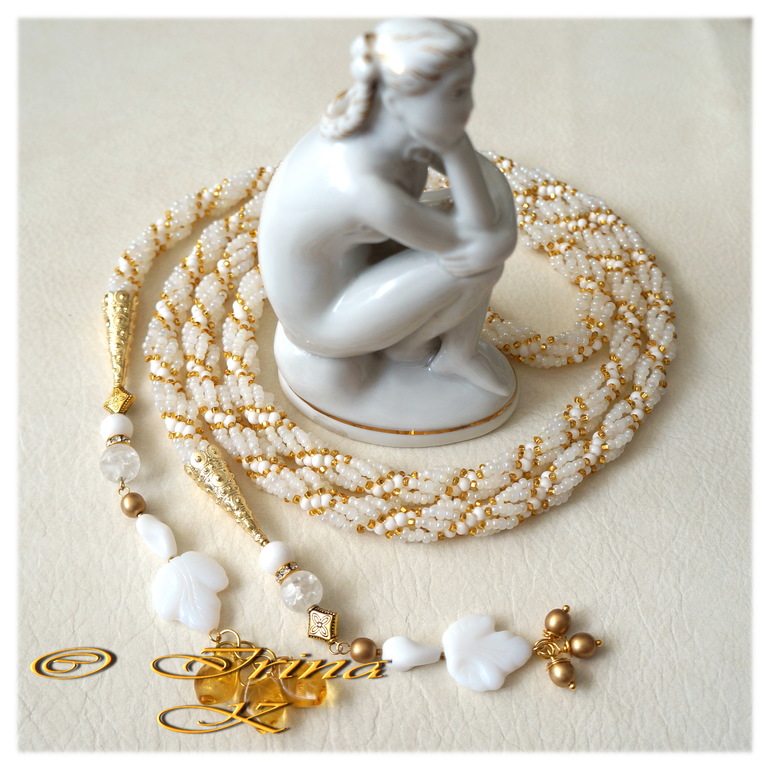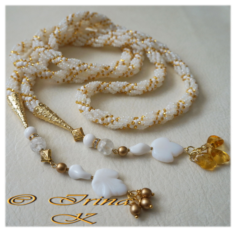 Лариат выполнен в технике "американский жгут", что придает ему дополнительной пластичности и возможности завязывать самые разные узлы.Бисер молочного оттенка разбавлен золотыми искорками, очень красивая фурнитура золотого цвета завершает стильный образ.