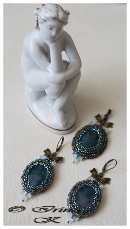 Похожий комплект я обнаружила в бабушкиной шкатулке с украшениями лет 30 назад и давно хотела сотворить такой же. И вот все сложилось: и чудесные кабошоны загадочного индийского мохового агата, и радужный бисер нужного оттенка, и нужная по дизайну и цвету фурнитура.