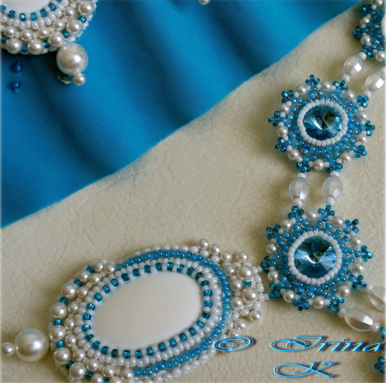 Шикарный тандем жемчуга Сваровски (Swarovski) и девственно белого, нежного кахолонга подчеркнуты бисером бирюзового цвета и кристаллами Сваровски цвета Aquamarine.