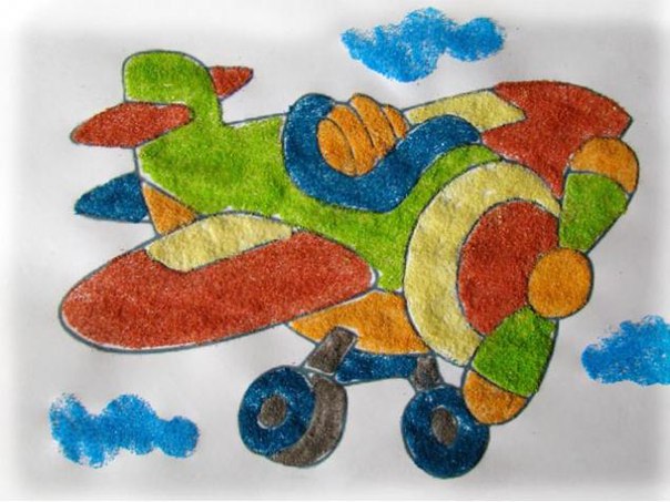 Песок - замечательнейший материал для детского творчества! Это и массаж для ладошек, и развитие мелкой моторики и богатство тактильных ощущений! Мы очень любим играть с песком летом. У нас есть любимый пляж на озере, где меленький, беленький чистенький песочек. Дети в нем зарываются, закапываются, купаются, строят замки и лепят куличики. Красота! А если песок, да еще и цветной, то можно и играть и делать поделки. Например, песочные фрески, или насыпные узоры в бутылке.