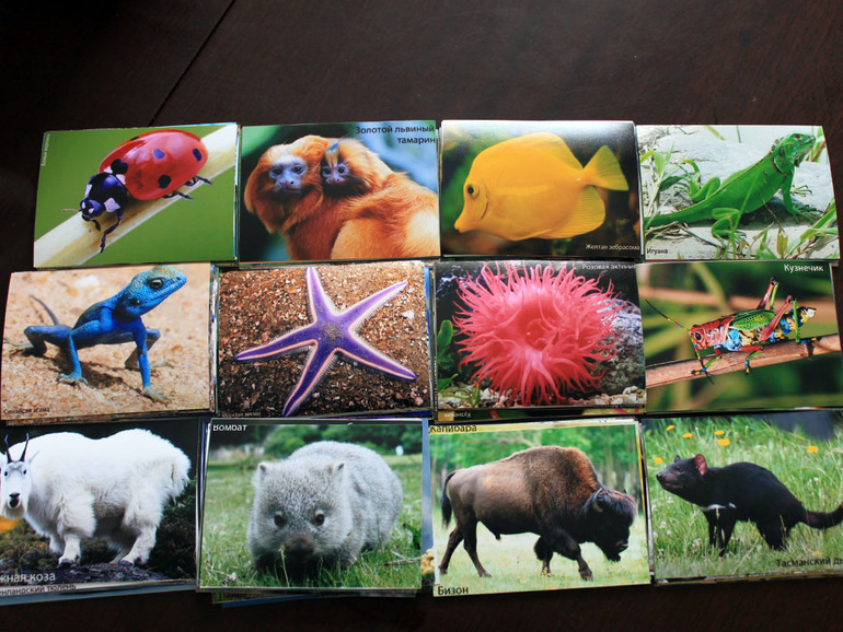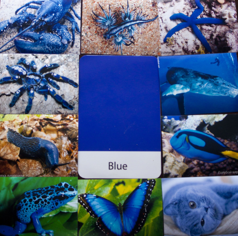 Кстати даже если ваш малыш уже отлично сортирует по цветам, то данные карточки возможно покажутся ему нетривиальной задачей и заставят иногда задуматься. Ведь во-первых, у природы нет четких цветов, и при разном освещении цвет может меняться. Например Соня иногда относит пантеру к фиолетовой группе и я ее не исправляю, а только говорю, что мне она кажется скорее черной. А во-вторых, мылушу предстоит сперва вычленить животное на фотографии, а потом уже определить его цвет. Например раньше фотографию желтой креветки на синем фоне София могла с ходу бросить в синюю стопку, но сейчас она таких ошибок уже не делает и внимательно анализирут изображение.