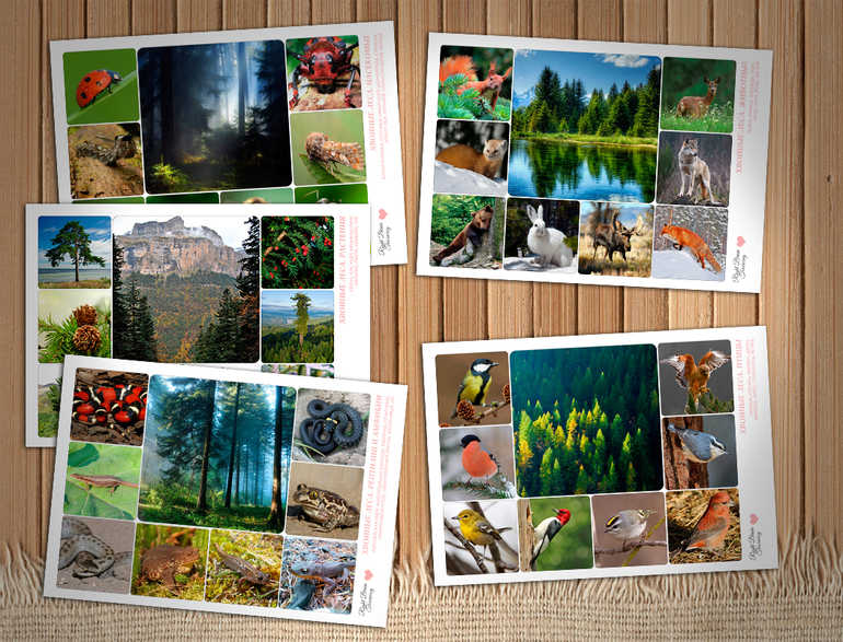 - Хвойные леса (насекомые, животные, птицы, растения, рептилии и амфибии);