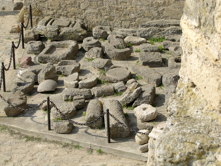лапидарий у подножья стены. Какие-то жернова, бассейны, наверное, бытового назначения.