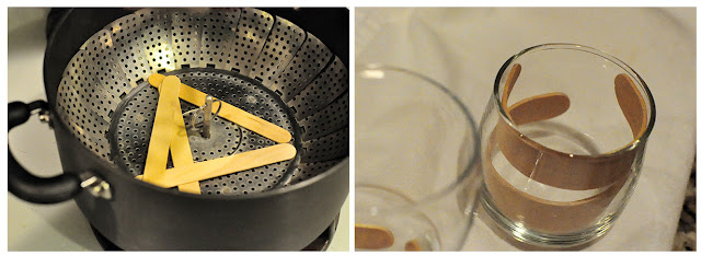 Сначала наливаем в кастрюлю воду и ставим ее на огонь, в емкость помещаем сито. На дно сита кладем палочки и ждем, пока они станут вялыми и можно будет их изогнуть так, как вашей душе угодно.