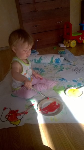 Сама просит рисовать или лепить. Пытается катать шарики. Рисование это конечно боди-арт и размазывание, но тем не менее, ей это интересно, а значит, мама терпит))