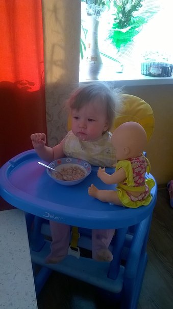Лезет везде! Залазит на диван, на стулья, на скамейки на улице, только успевай страховать да подхватывать. Когда гуляем на улице, всегда в коляске стараюсь иметь пакет с семечками. Когда видим голубей, Ксюша их кормит.