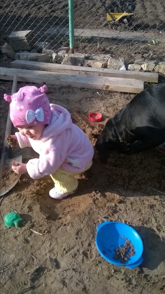 То куриц смотрим своих или соседских, то на качелях качаемся, то помогает маме полоть) весь лук в теплице, на зелень посаженный уже повыщипала))