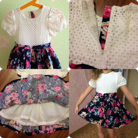 Просто шикарное платье! Отличные материалы: сверху кружево-сеточка с тонким хлопковым подкладом (опускается до низа платья), на юбке - плотный хлопок. Сшито аккуратно. Порадовала полоска ткани под молнией (единственное, что она могла бы быть белого цвета, но и так хорошо - главное что молния не будет царапать спину ребёнку). Замеры платья соответствуют приведённым в таблице. В общем довольна на все 100%, редко встретишь такое качество за такие деньги.