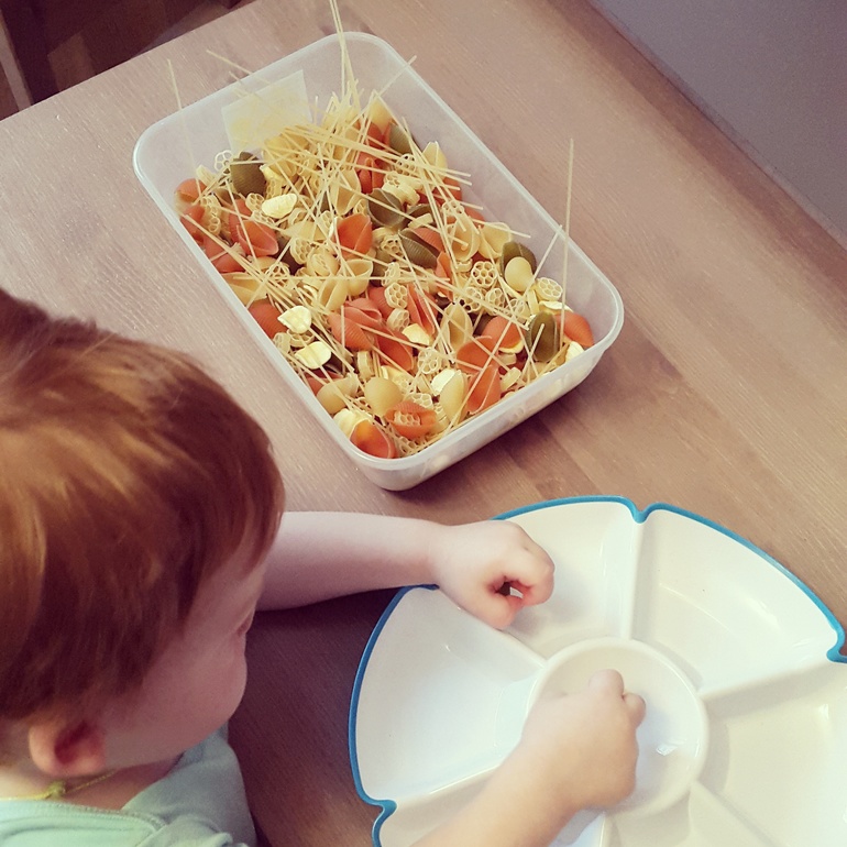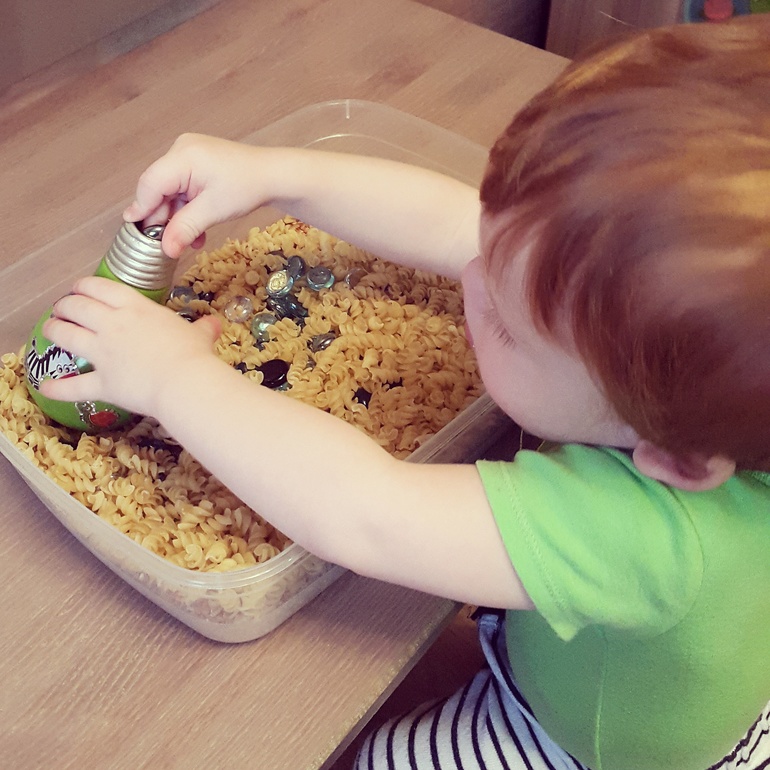 У меня 7 пластиковых коробочек с крупами и макаронами. Вообще я жуткая лентяйка, и мне проще сразу все организовать правильно, чтоб в дальнейшем не тратить на это время. Мне удобно хранить и давать Николаю сенсорную коробку в пищевом контейнере. Открыл крышку, поставил на поднос, поиграли и убрали. Изначально я насмотрелась на безумно красивые сенсорные коробочки у мам тут и загорелась. Первое время мы играли в ванной и с соской. Николай руками выбрасовал из емкости вокруг себя. Далее я убрала соску и добавила цветные камушки, потом завернула их в фольгу. В дальнейшем давала миску и ложку. Когда более менее научился играть, мы перешли на игры за столом, присоеденила фигурки животных. Но вся игра Николая заключалась в их выкидывании на пол, после этого интерес к коробочке терялся. Поэтому мы временно убрали животных в сторону.