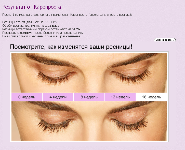 Хочу поделиться своей находкой! А именно, нашла замечательное средство под названием Карепрост , которое быстро восстанавливает рост ресниц, укрепляет их и делает гуще. На протяжении одного месяца пользования вы уже сможете видеть результат!