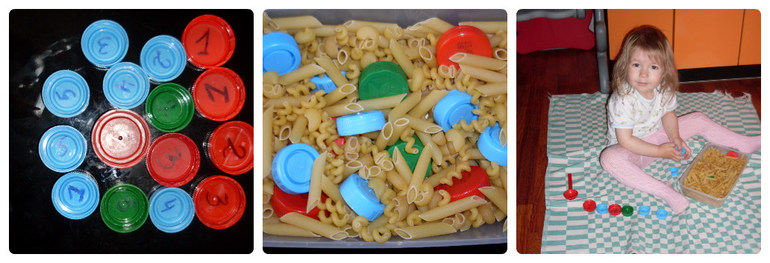 Играли с математической сенсорной коробочкой. На крышки я написала цифорки от 1 до 5, закинула их в разные макарошки. Дочка их искала, раскладывала на кучки, потом раскладывала по порядку (с моей помощью), потом еще просто по цвету крышечки раскладывала