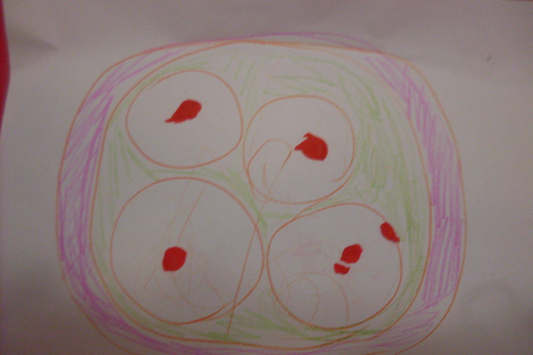 Мы делали вот такие блинчики - сначала рука в руке рисовали блинчики, затем Вика украшала их "ягодками" - пластилином