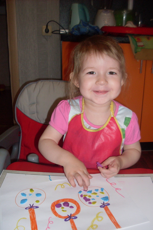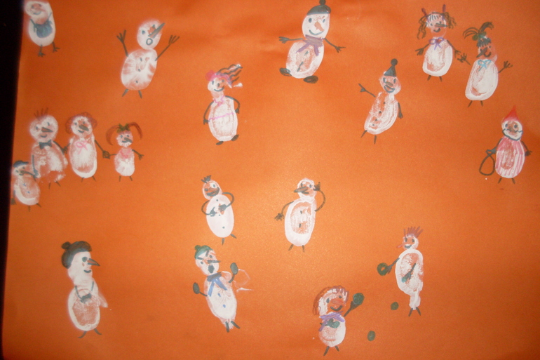 13) Рисунок отпечатком пальца "Снеговики" - головы дочин пальчик, тела мои. Ох, и намучились с этой работой! Викуська совершенно не хочет ставить точечки отдельно друг от друга - все надо в кучу, еле успевала ее останавливать)) А еще она умирала от нетерпения узнать, что в итоге получится))