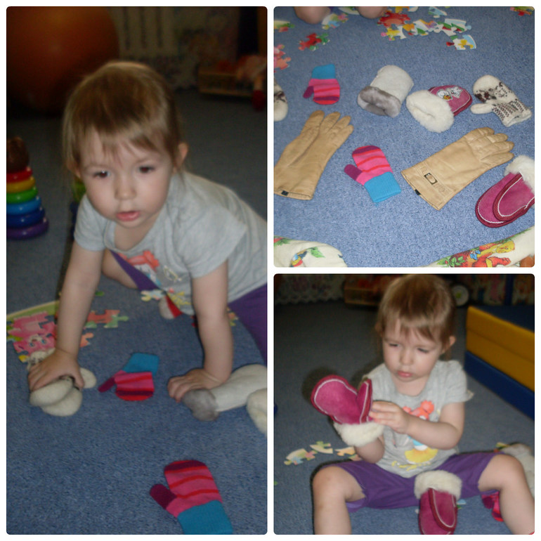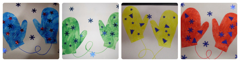 8) Ищем пары варежек - перчаток. Трогаем (тактильные ощущения описываем). Создаем аппликации "Варежки" (будущие подарки нашим дядям)