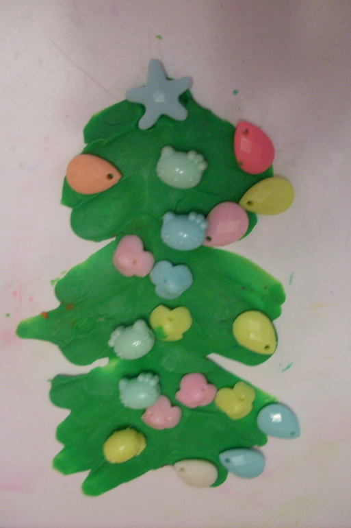 4) Размазываем пластилином елочку, украшаем ее бусинками - одно из любимых занятий
