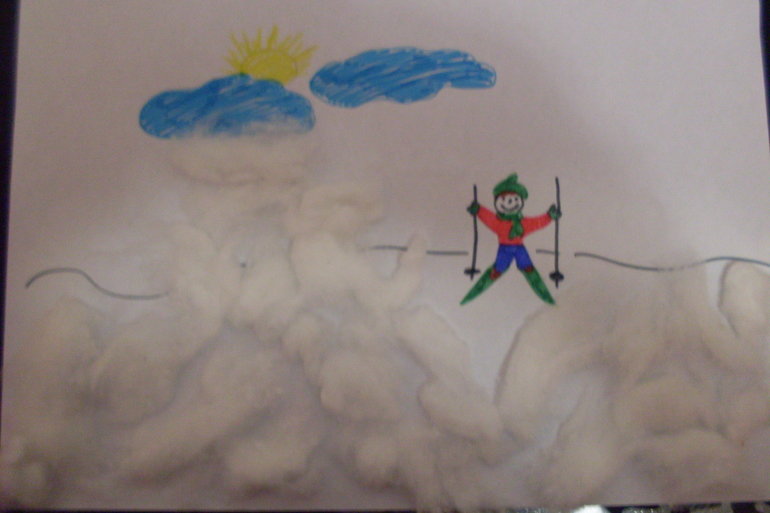 10) По книге "Зима" Ульевой делаем задание: создаем из клея и ваты снег и снежную горку для лыжника