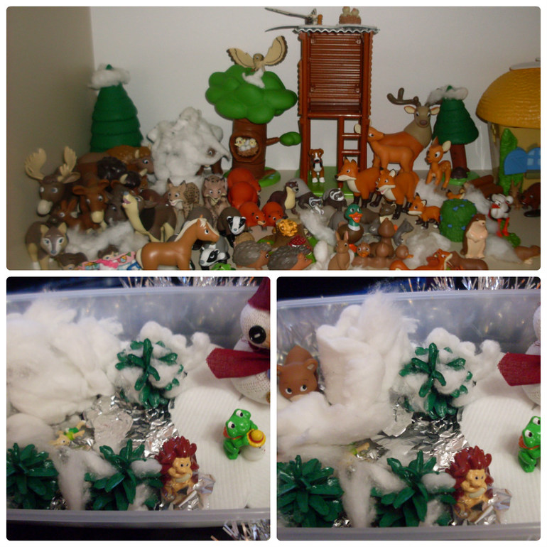 12) Так как в этот день мы праздновали (чуть-чуть) Викусины 2 с половиной годика, то задание простое: поиграть с инсталляцией "Зимний лес" и сенсорной коробочкой "Зима". Про инсталляцию: Вика с утра (я делала когда она уже легла спать) даже не заметила ничего)) Я говорю "сходи в лес, там что-то изменилось" (имела ввиду, что зима пришла). Доченька "Мамочка,ты зачем в лес ваты накидала?"