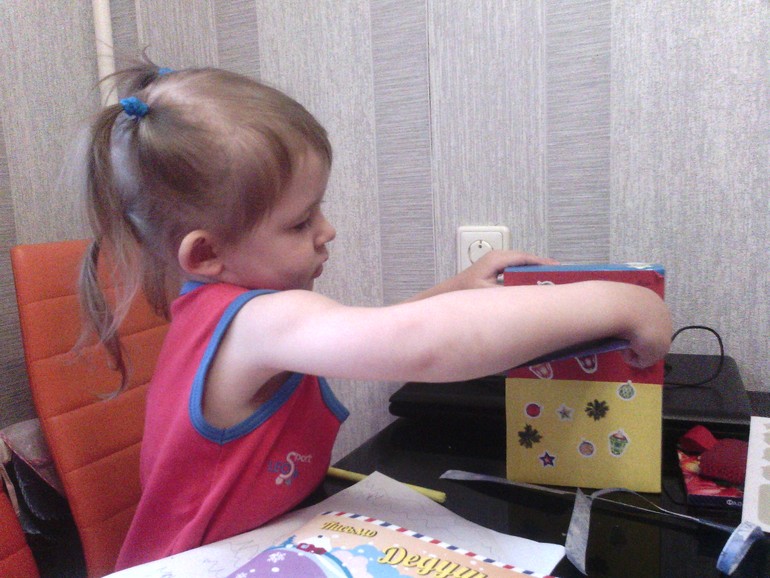 2) Лепим из пластилина елочку, подарки, снеговика. Викуська сама катала колбаски для елочки и приделывала к стволу, украшала бусинками; для снеговика катала шарики и ставила друг на друга + сказала письмо ему надо) подарочки украшала, пробовала сделать - я подравнивала за ней