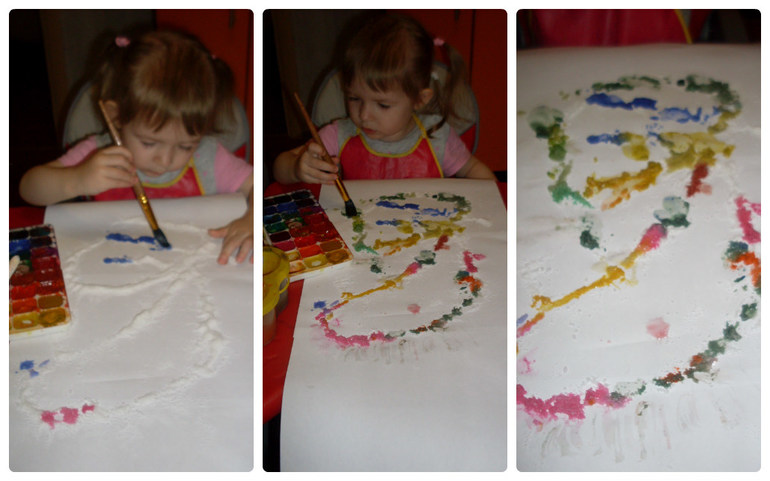 11) Создаем соляные узоры (снежинка - делаем из соли и краски). Дочери понравилось, правда краски все измазюкала)))