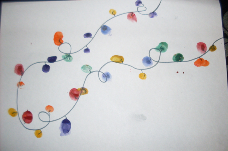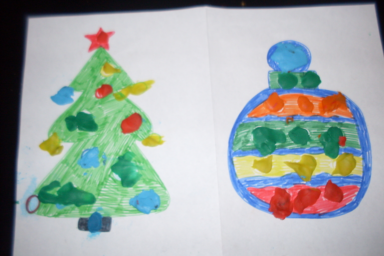 20 число: сделали картинку "гирлянда на елочке": пальчик + краски. Получилось очень неплохою Самое трудное уговорить дочу ставить только один раз отпечаток, а не тыкать на одном месте 100 тысяч раз(((