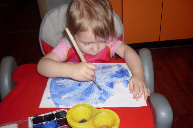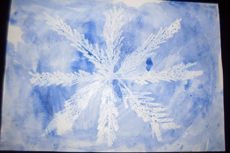14 число: делала рисунок в технике свеча + краски. Я заранее нарисовала снежинку свечой, доченьку попросила весь лист закрасить синей краской. Очень было забавно наблюдать, как Викуська пыталась закрасить места, где проявлялся рисунок (краска оттуда стекала), я ей говорю "раскрашивай дальше и увидишь картинку", но Вика девочка упертая, продолжала закрашивать, в итоге насочиняла ей историю про волшебство и она быстренько все закрасила и увидела снежинку, говорит "здорово!" и через секунду "давай другое заданьице")))