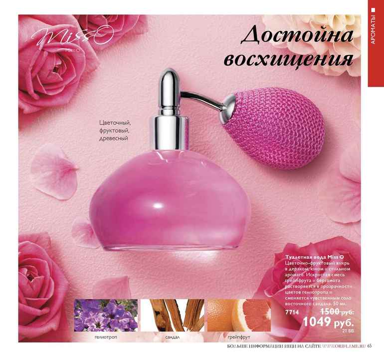 Туалетная вода Miss O Код: 7714 Объем: 50 мл. Цветочно-фруктовый вихрь в дерзком и стильном аромате! Искристая смесь грейпфрута и бергамота растворяется в прозрачности цветов гелиотропа и сменяется чувственным соло восточного сандала. Легкий и соблазнительный аромат сочных фруктов и нежных цветов. Изящный розовый флакон и распылитель в виде груши. Подчеркнет твою индивидуальность и поможет почувствовать себя на высоте.