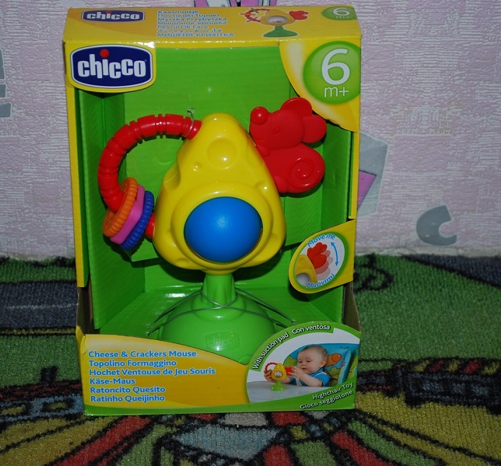 Мышка с сыром и крекерами-замечательная игрушка!Она весёлой расцветки,с забавным мышонком,внушительным куском сыра,разноцветными,шуршащими шариками в центре игрушки,и с тремя колечками разных цветов.Мышка умеет двигаться,издавая треск.Сама игрушка прочно прикрепляется к столику,и несмотря на сильные ручки нашей дочурки-и с места не сдвигается!Это огромный плюс!Пока маленькие ручонки переберут все детали этой чудесной игрушки-порция съедена!Так что эта весёлая мышка способствует аппетиту нашей вреднульки!Небольшие габариты игрушки позволяют брать её с собой в дорогу, или в гости! Качество всех деталей и основных частей приводит в восторг,хотя все игрушки от Chicco весьма высокого качества,за что мы и любим Chicco!