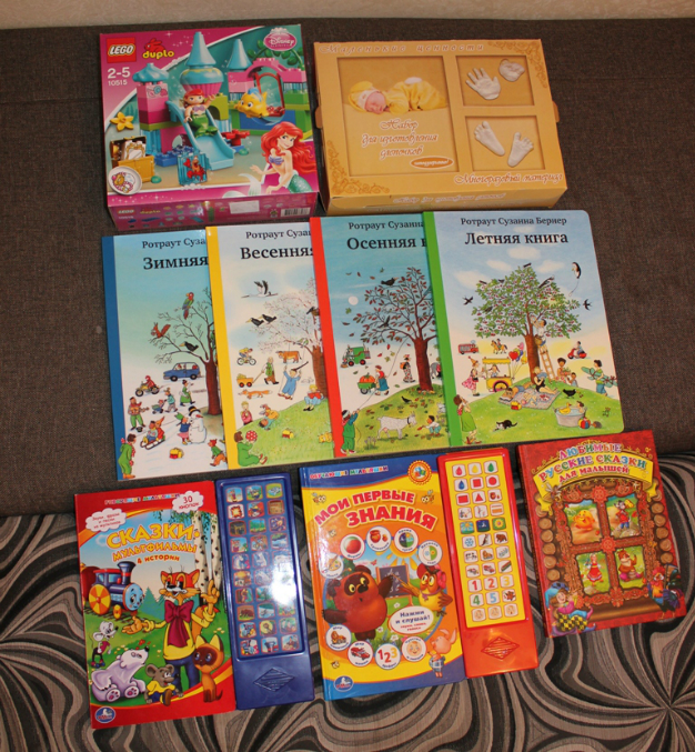 Набор Лего Русалочка от крестного, Набор для изготовления слепочкой от сестры мужа, набор книг Ротраут Бернер от нас с папой, музыкальные книги от пробабушки; Книга со сказками от бабушки в придачу к велику.