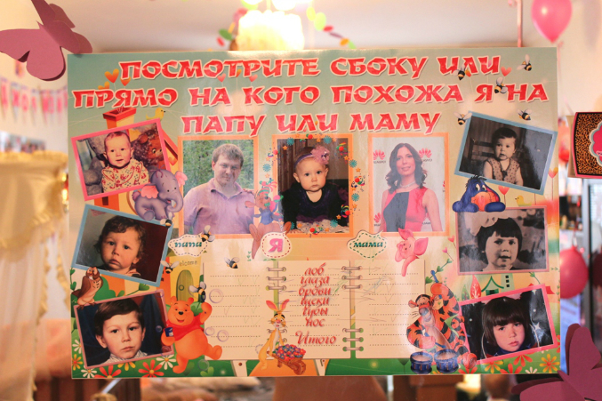 А этот плакат "На кого я похожа" вызвал много смеха, так как все считают, что дочь вылетая папа:) Говорят мне "Ты этот плакат повешала поприкалываться?!" Ну в итоге, все равно, некотьорые гости в Лизе нашли и мои черты :)