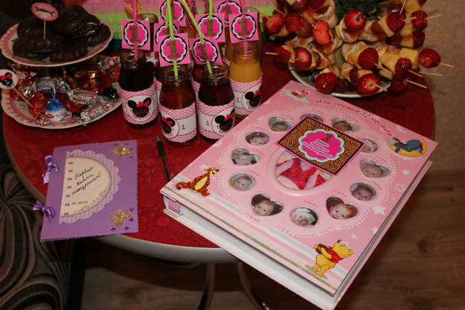 Ну а это сладкий стол, на котором располагались: метровая единица (на нее у меня ушло 3 дня), Лизина фотография в рамочке, сладости, "фруктовый" ананас, соки десткие и взрослые (их я разлила в бутылочки изпод детских соков и на бутылочки наклеила праздничные этикетки. ну и трубочки втавила под цвет Еденице. Также на этом столе разместила Лизин Альбом и Первую Книку пожеланий (ее тоже делала сама). Эту книгу гости заполняли до конца вечера.